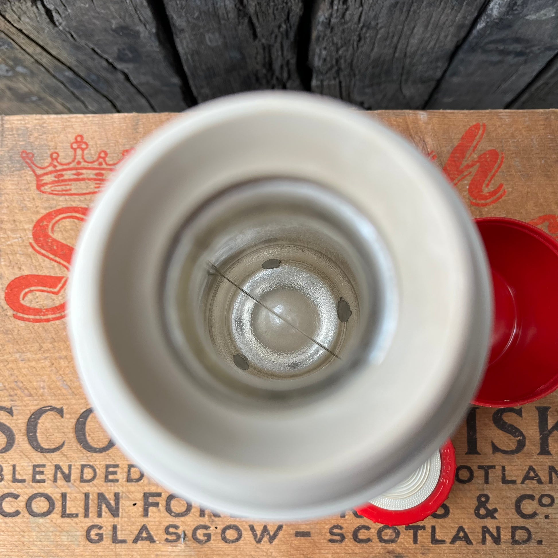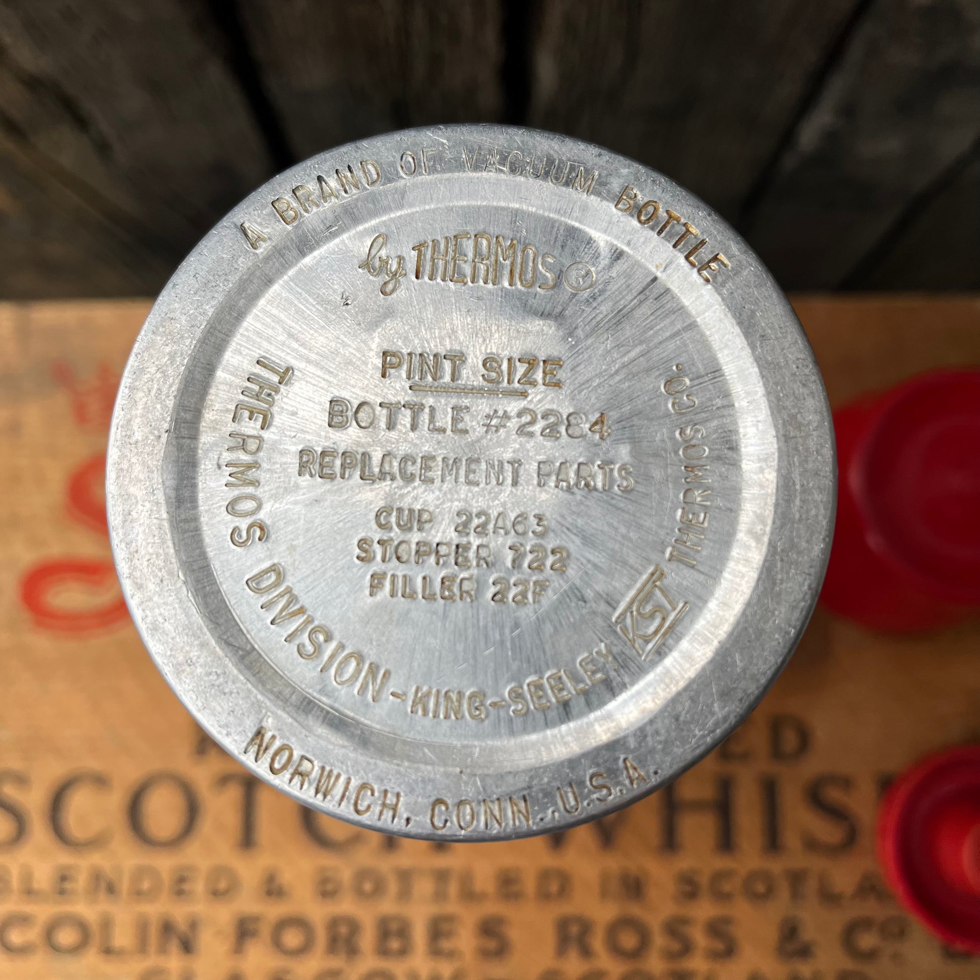 パイントサイズの容量と赤いカップで、外出先で温かい飲み物や冷たい飲み物を楽しむのに使われていたボトルです。