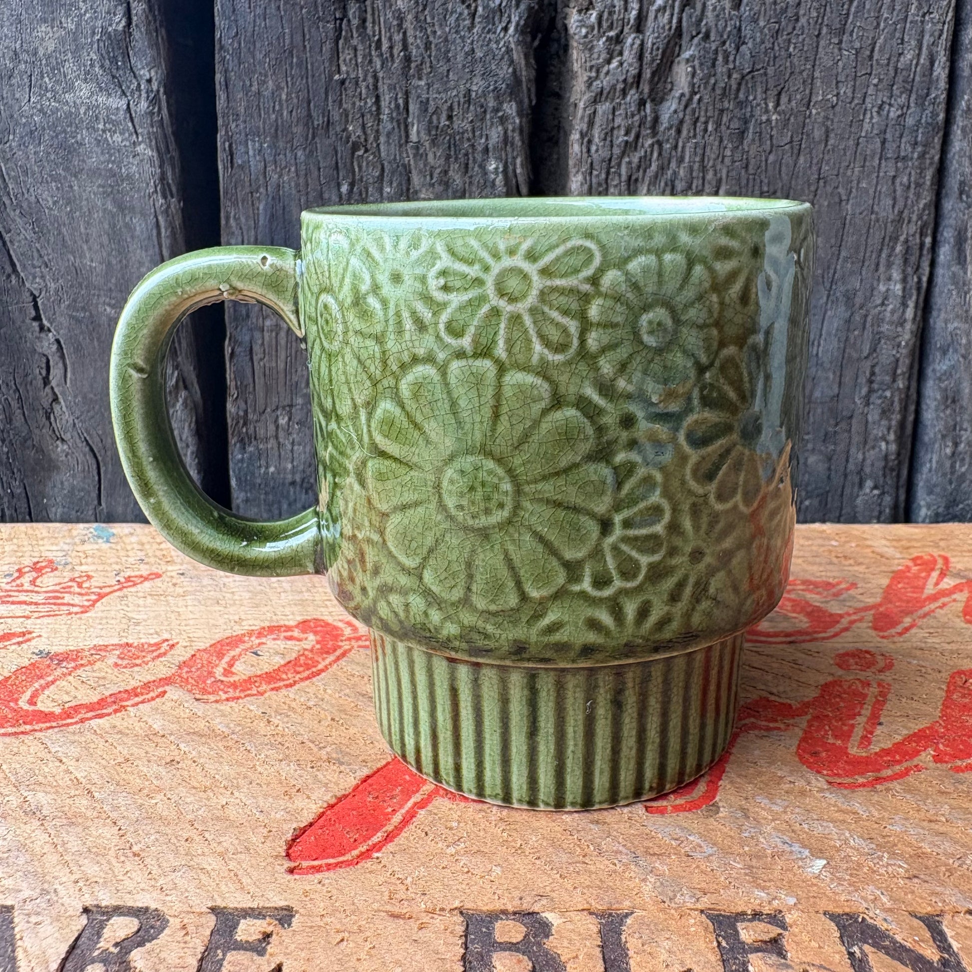 落ち着いたグリーンにレトロな立体的なお花模様、