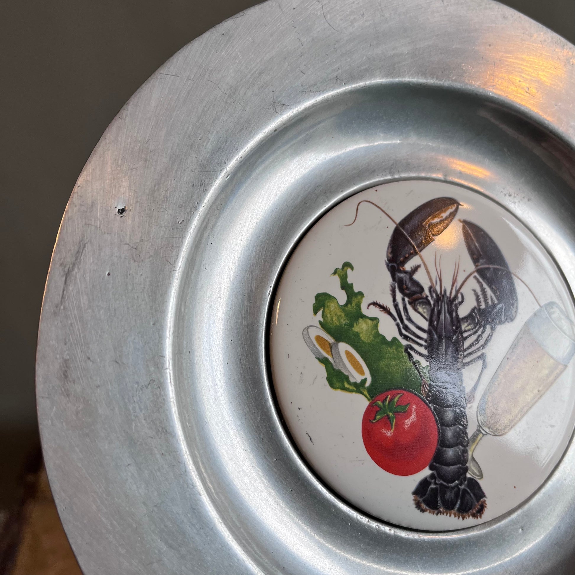 アルミ製のプレート、真ん中に、ロブスター、ビール、トマトなどの絵がプリントされています。