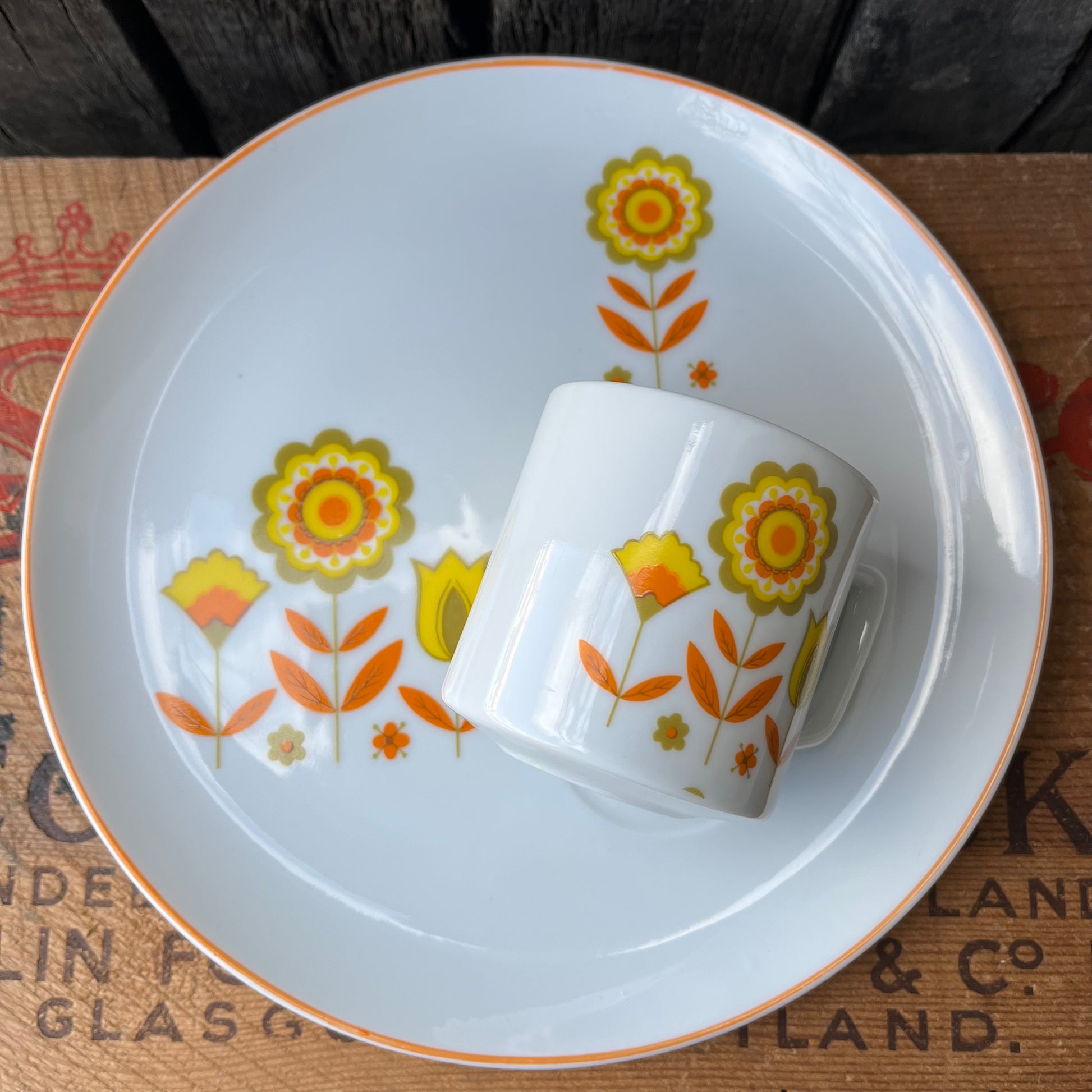 寸胴型のシンプルな白いカップに、オレンジと黄色の花柄がレトロかわいいデザインです。