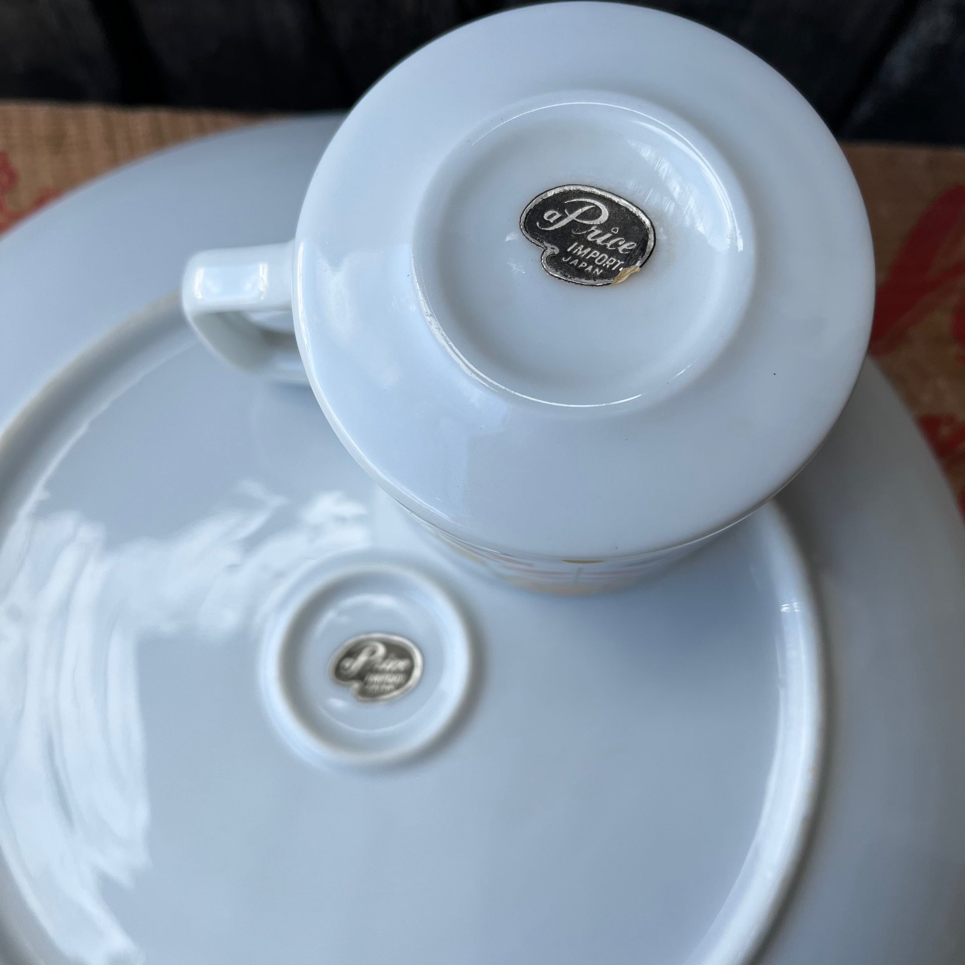 ミッドセンチュリーモダンスタイル、A Price IMPORT JAPANのマークが付いた、カップとスナックプレートのセットです。1960年代から1970年代に人気がありました。