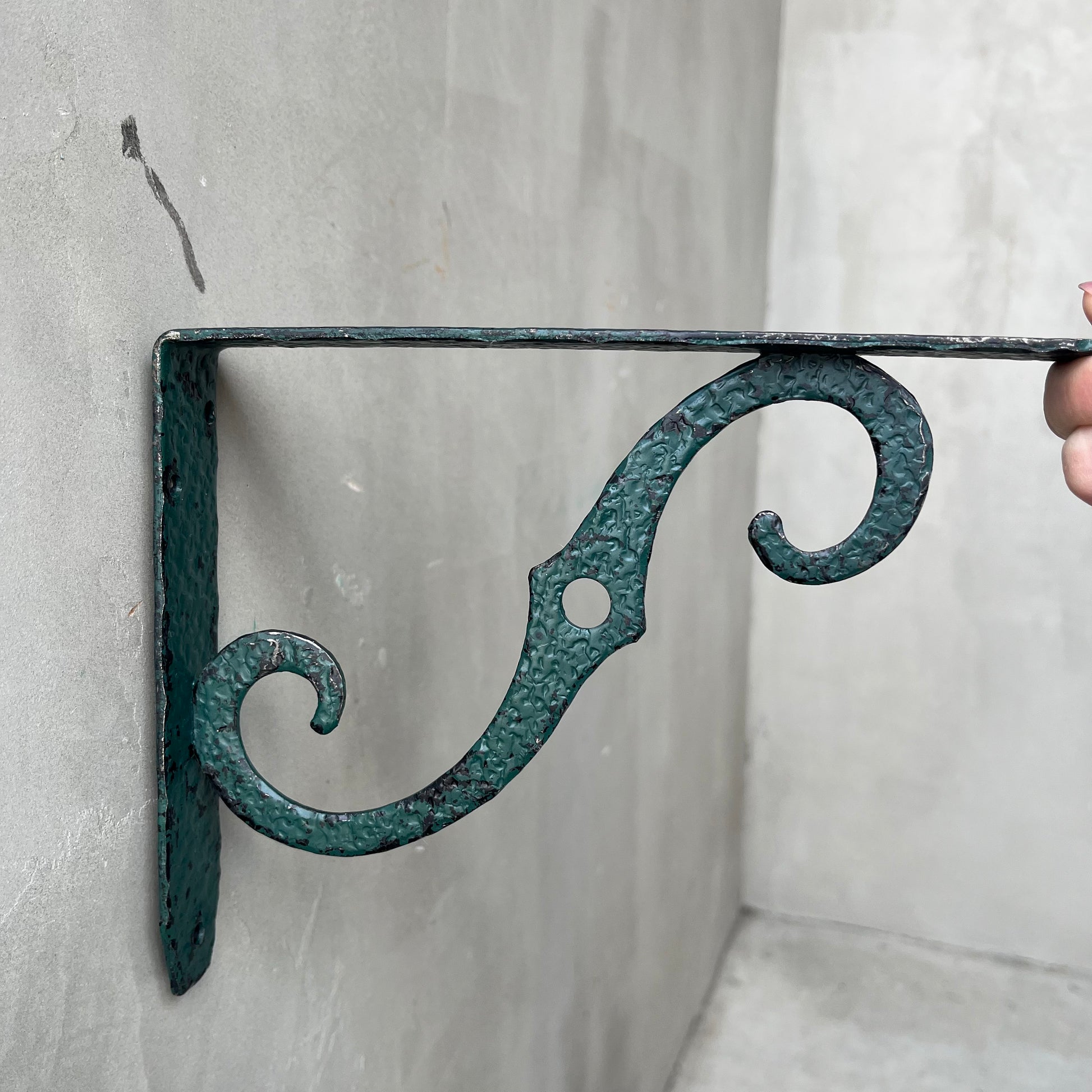 壁面に取り付けて棚板を支える、装飾的な棚受け金具です。
