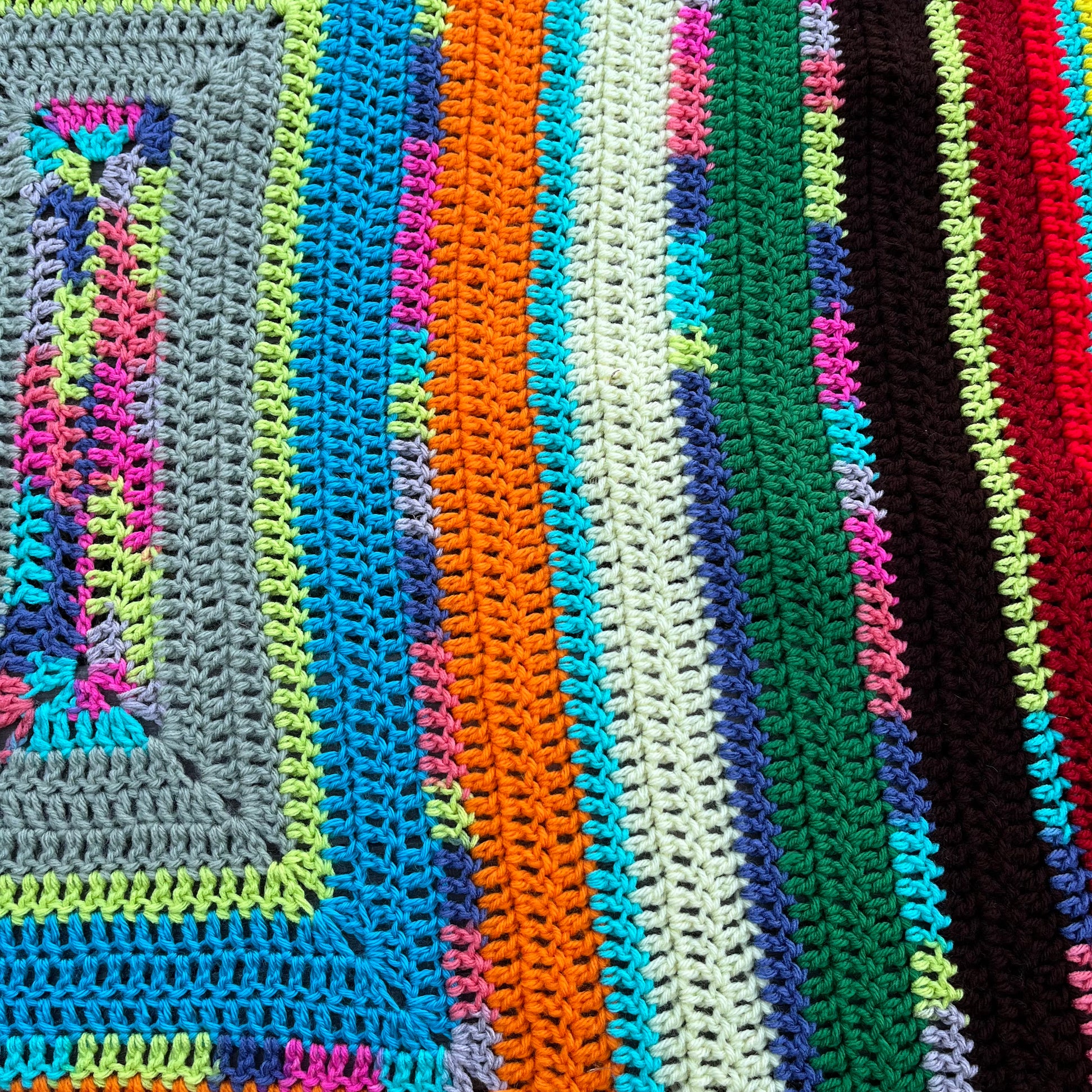 たくさんのカラフルな毛糸を使ったスクエア柄のブランケットです。