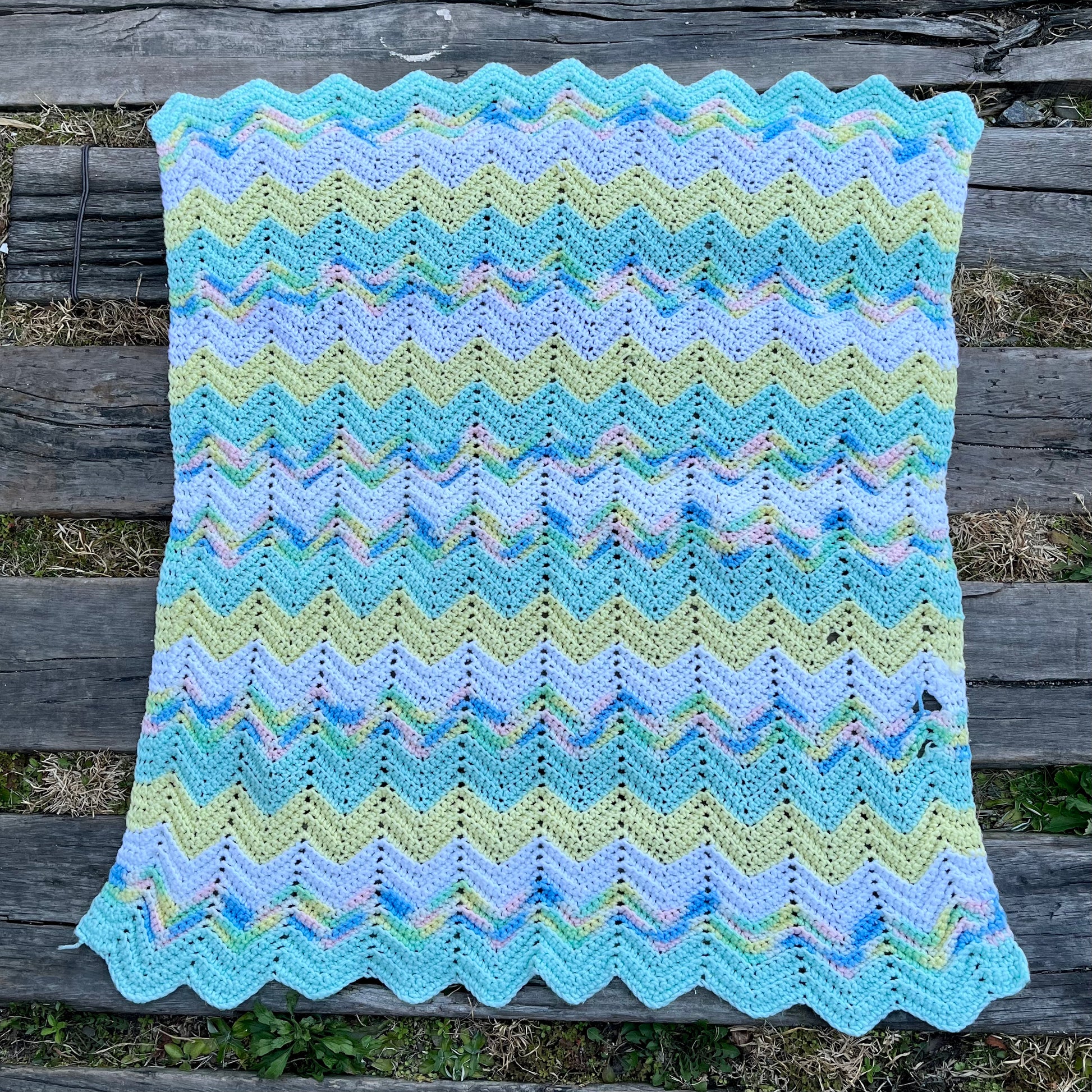 パステルカラーのシェブロン(波模様)柄のグラニーブランケットです。