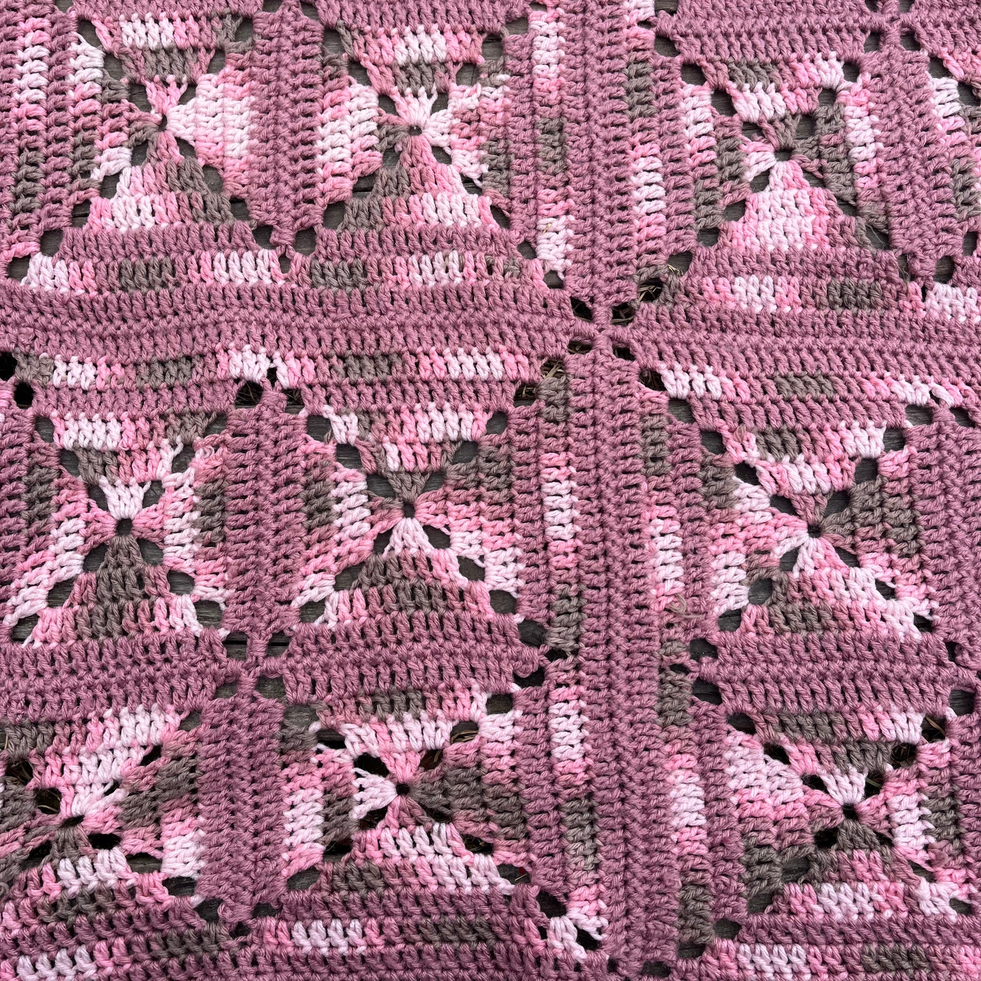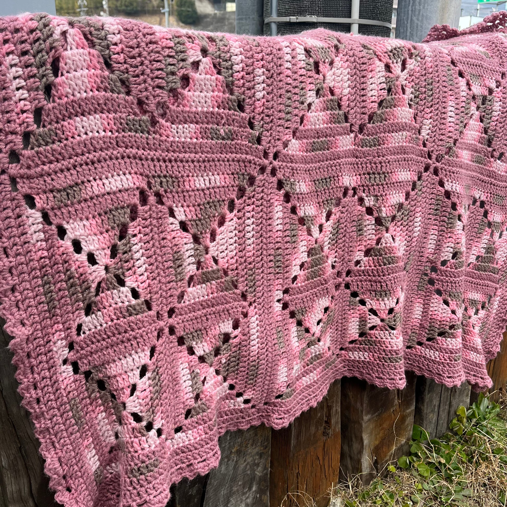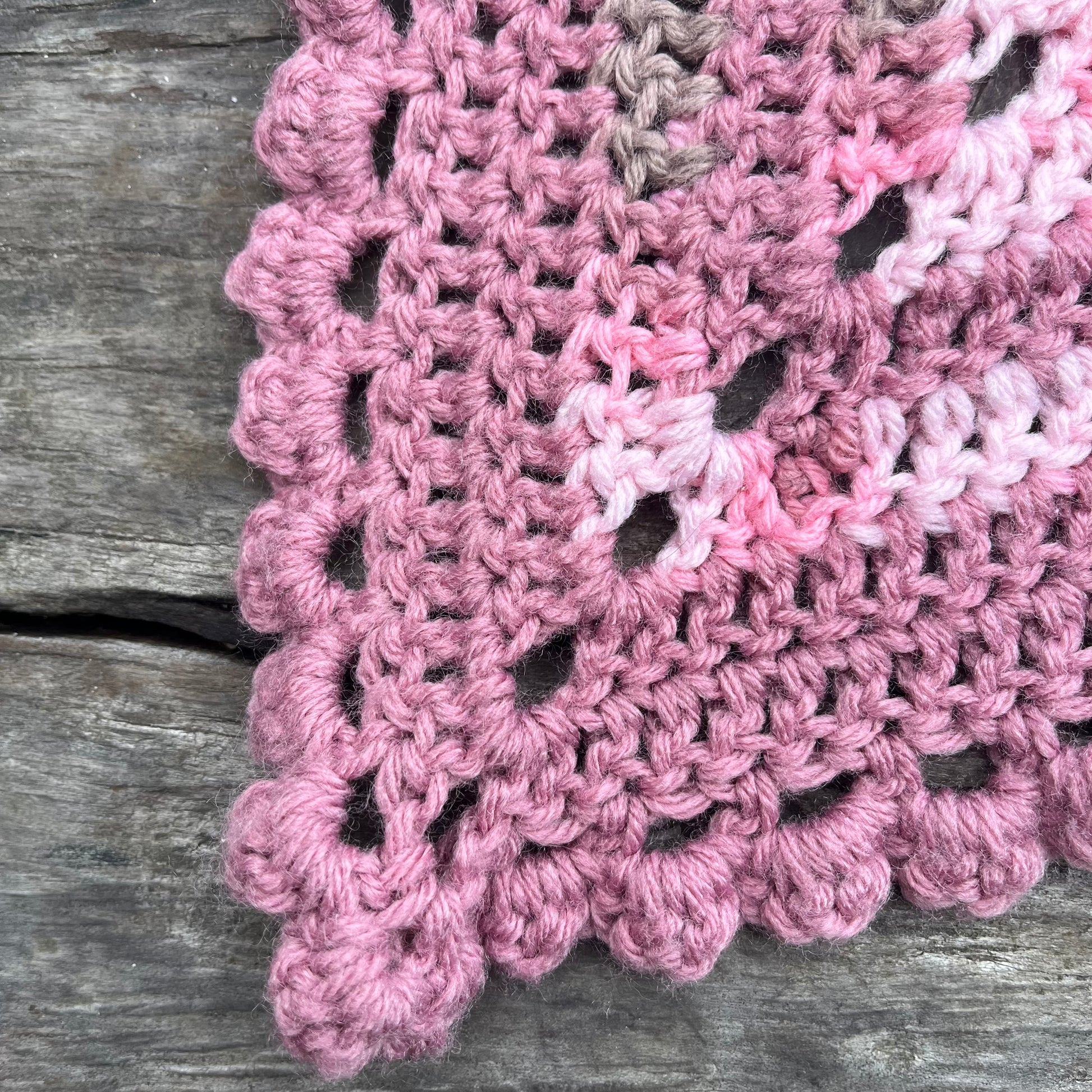 ピンクとグレーのグラデーションが美しい手編みのグラニーブランケットです。