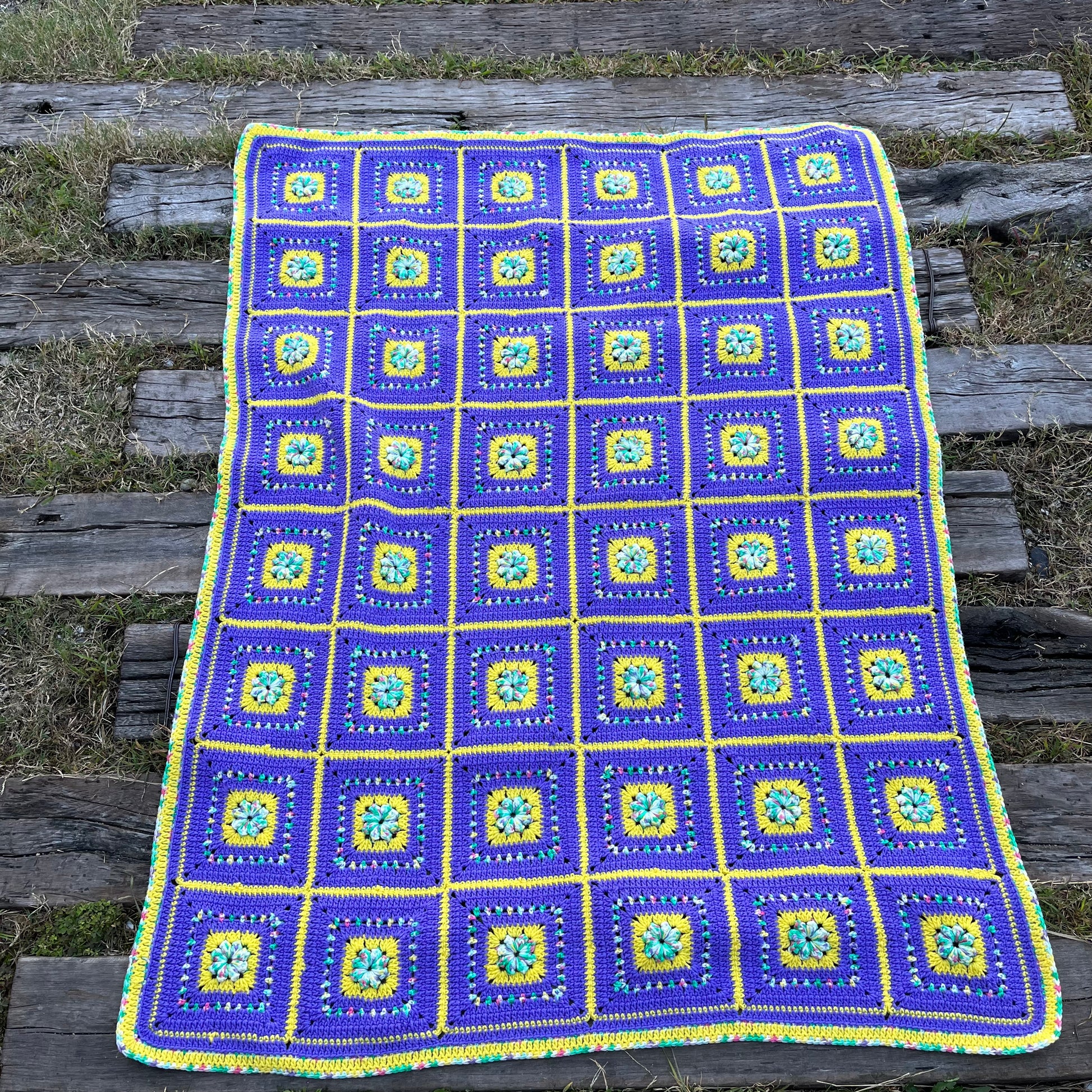 紫をベースとしたたくさんのモチーフをつなぎ合わせて編まれているグラニーブランケットです。