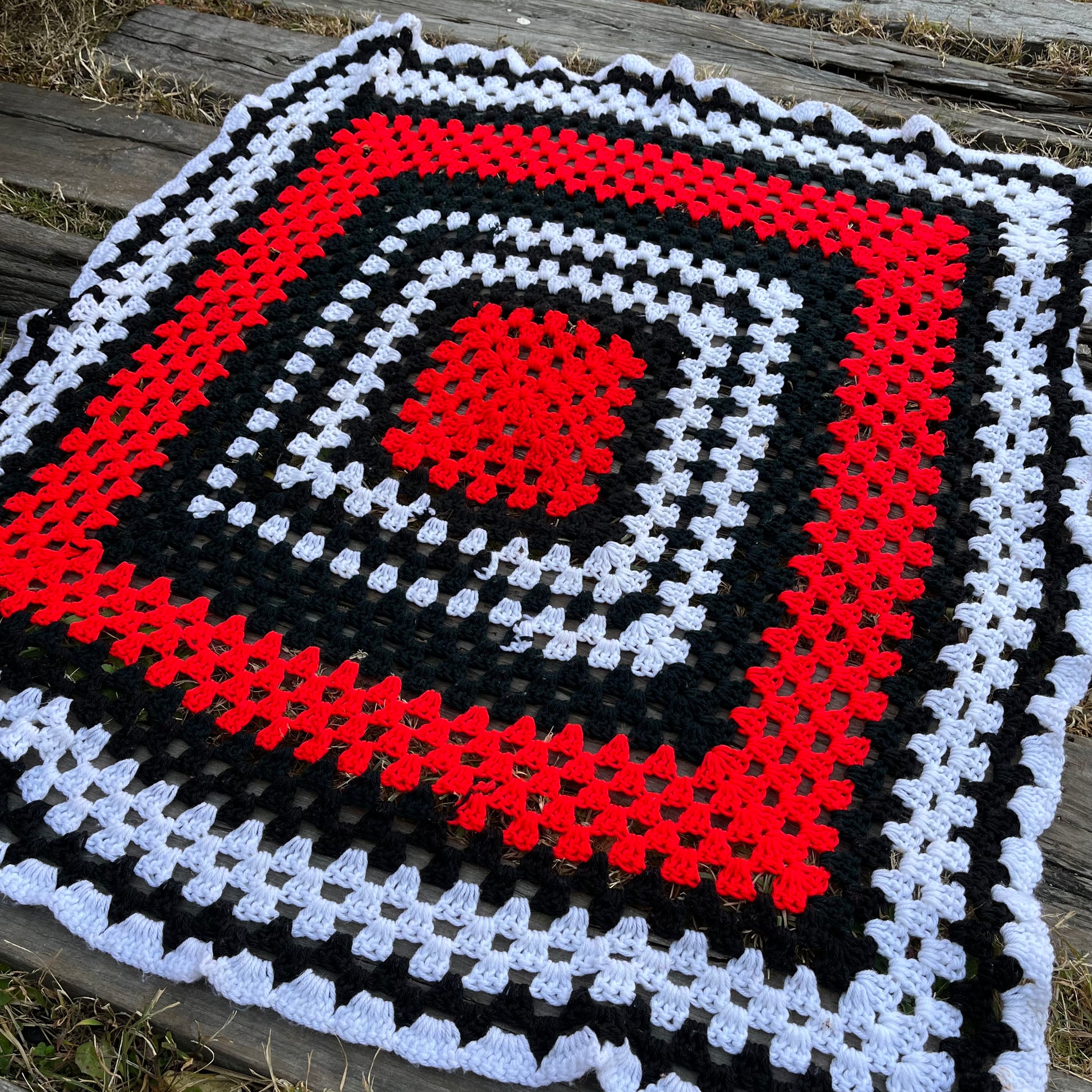 赤、黒、白のグラニースクエアを組み合わせた手編みのブランケットです。