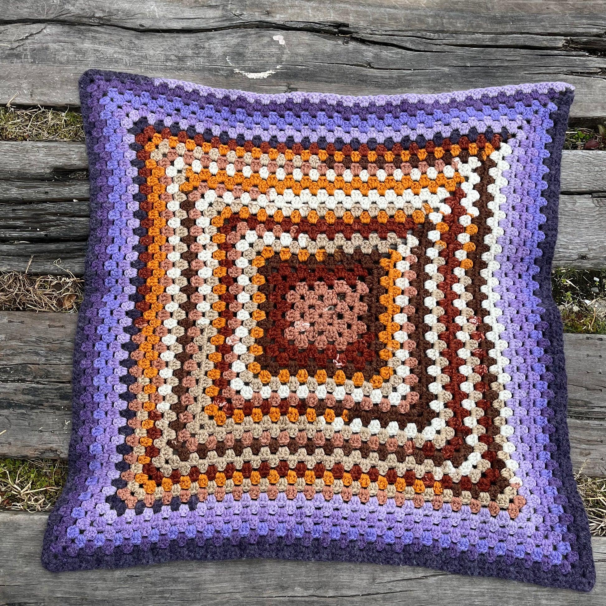 紫や茶色などを使ってグラデーションになるように編んであるグラニーブランケットです。