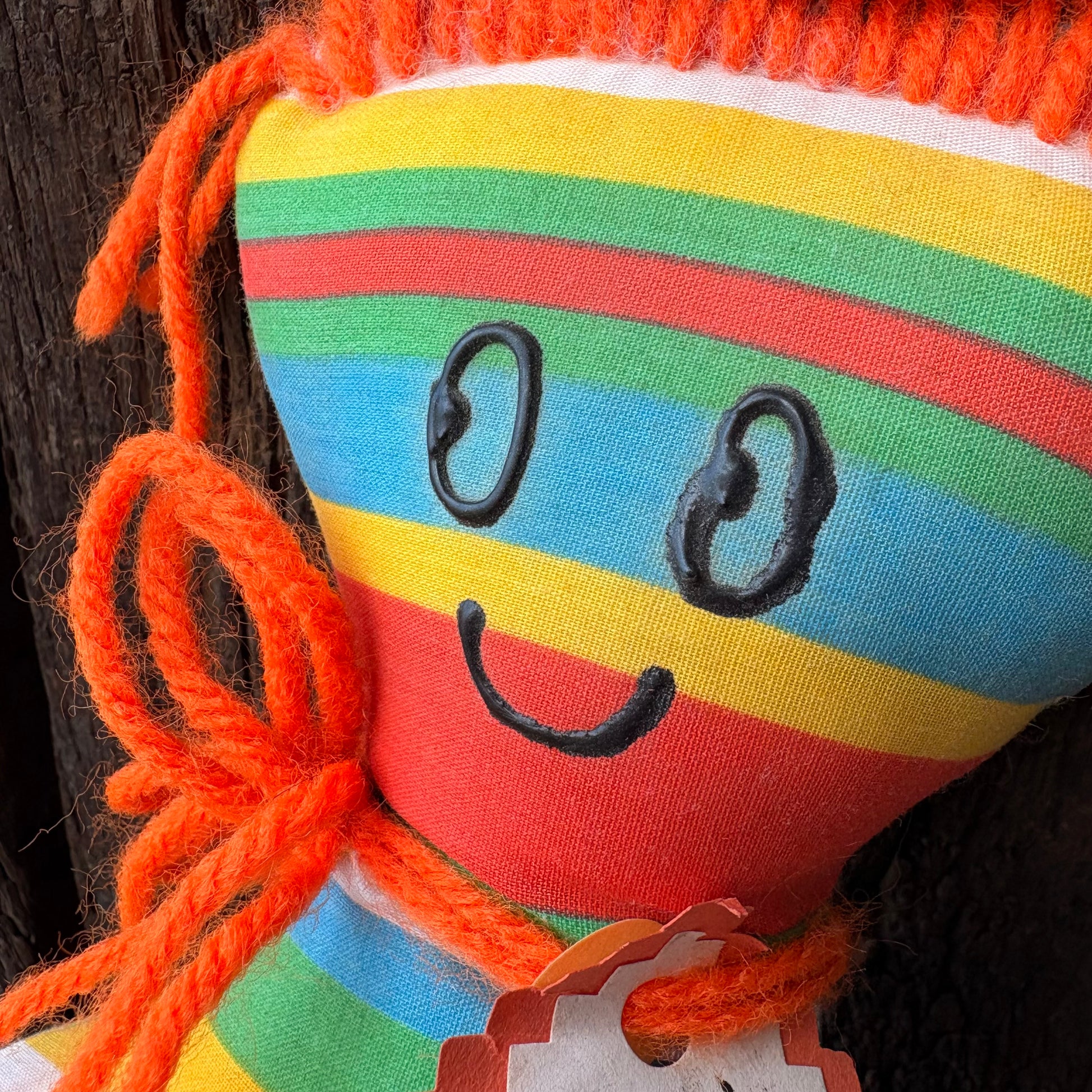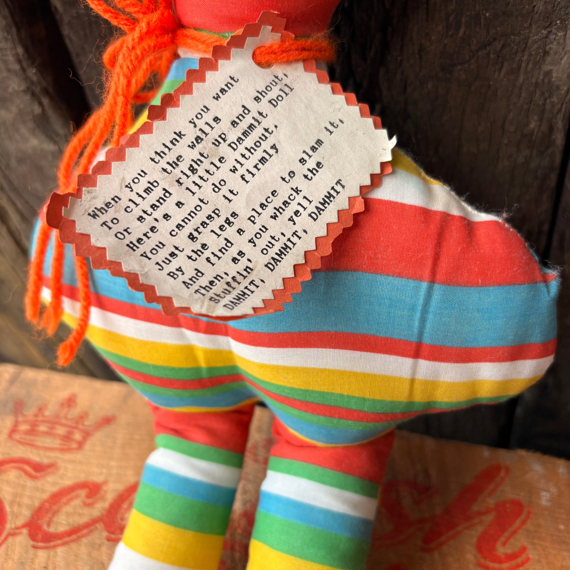 首元にはユーモアのある英語のメッセージタグが付いており、